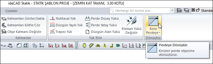 Kirişi perdeye komutuyla kirişler perdeye dönüştürülür. Mimari ve statik projelerin herhangi bir aşamasında, döşemesi tanımlanmış kirişler, bodrum çevre perdeleri gibi iki kolon girilmiş perdeleri dönüştürme ihtiyacı hissedilebilir. Kirişin yerine perde tanımlayabilmek için mevcut döşeme ve kirişler silinmek zorundadır. Kirişi perdeye komutu ile tek seferde döşeme ve kirişler silinmeden perdeye dönüştürülür.