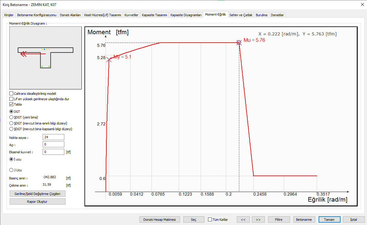 “Kiriş Betonarme” penceresinin “Kapasite Tasarımı” sekmesinde, yukarıda anlatılan prensipler kullanılarak her bir yükleme kombinasyonunda kapasite oranları hesaplanmaktadır.