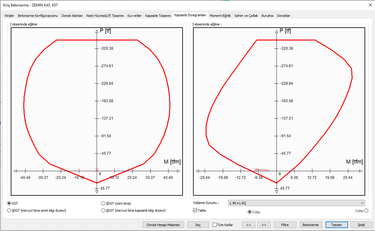 Yukarıda anlatıldığı üzere her bir eksenel kuvvet ve iki eksenli moment değerlerinde kapasite oranı farklı değerler alabilmektedir. Aşağıdaki resimde betonarme bir kirişte da M2 ve M3 eksenleri için hesaplanan etkileşim eğrileri gösterilmiştir. Ancak kiriş tasarımı yapılırken kullanılan etkileşim eğrisi üç boyutlu olarak hesaplanmaktadır.