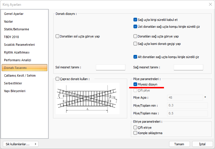 Kirişlerde pilyesiz tasarım için Kiriş Ayarları/Donatılar sekmesinde Pilyesiz Dizayn seçeneği işaretlenmelidir.