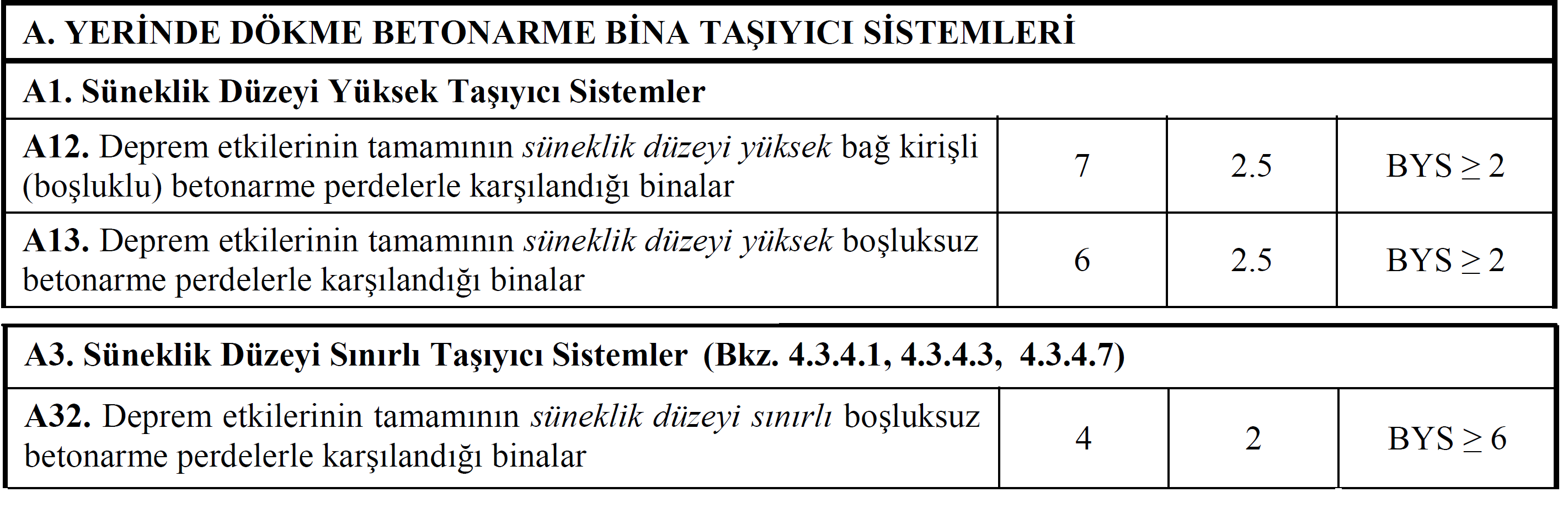 Sadece kirişsiz döşemeler içeren betonarme taşıyıcı sistemlerde deprem etkilerinin tamamı süneklik düzeyi yüksek boşluklu ve/veya boşluksuz veya süneklik düzeyi sınırlı boşluksuz perdeler tarafından karşılanacaktır. Bu durumda kirişsiz döşemeler içeren yerinde dökme betonarme binalar için yalnızca aşağıda gösterilen A12, A13 ve A32 taşıyıcı sistemleri kullanılabilir.