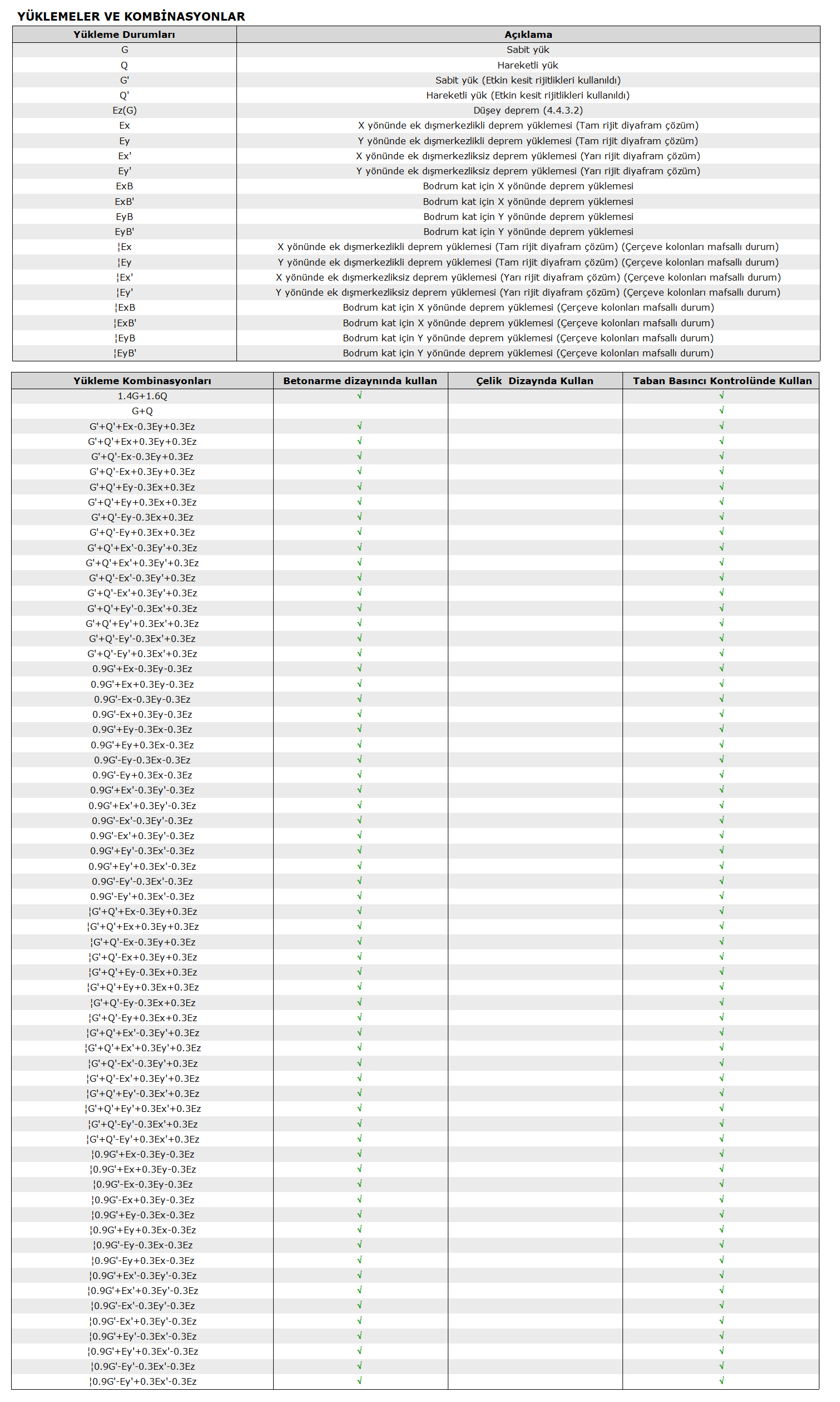 Aşağıda gösterilen raporda kirişsiz döşeme içeren bir betonarme binanın yükleme durumları ve yük birleşimleri (kombinasyonları) görülmektedir. Bu tabloda Ex , Ey , Ex' , Ey' gibi başında herhangi bir işaret bulunmayan yükleme durumları ikinci aşama hesaptan, diğer bir deyişle çerçeve kolonlarının mafsallı olmadığı durumdan elden sonuçları göstermektedir. :ExExEx: gibi başında çift çizgi bulunan yükleme durumları ise birinci aşama hesaptan, diğer bir deyişle çerçeve kolonlarının mafsallı olduğu durumdan elden sonuçları göstermektedir. Yükleme kombinasyonlarında da benzer bir uygulama yapılmaktadır.