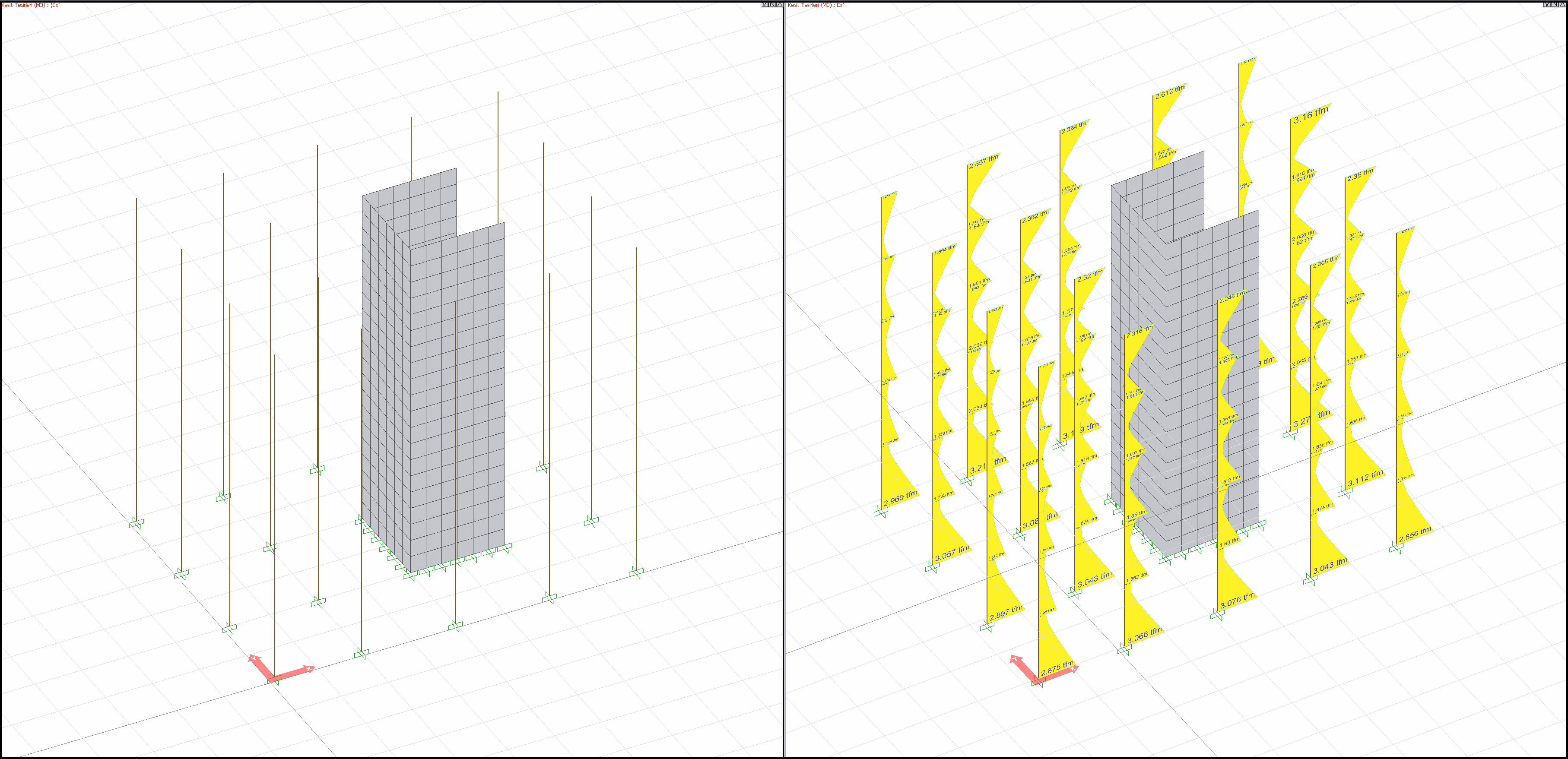 Aşağıdaki resimde kirişsiz döşeme içeren bir binanın mod birleştirme yöntemi ile deprem hesabı sonucu kolonlarda oluşan moment değerleri görülmektedir. Görselin sol tarafındaki hesap birinci aşama hesap (kolonların iki ucu mafsallı) sonucu elde edilen sonuçlardır. Görüldüğü üzere kolonların iki ucu mafsallı olduğundan herhangi bir moment değeri görülmemektedir. Sağ taraftaki hesap, ikinci aşama hesap sonucu elde edilen sonuçlardır. Görüldüğü üzere kolonlar monolitik bağlandığından kolon uçlarında momentler oluşmaktadır.