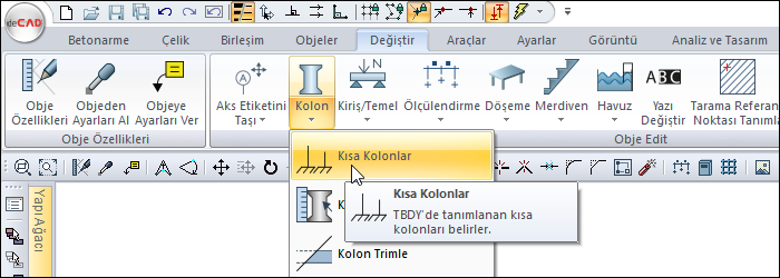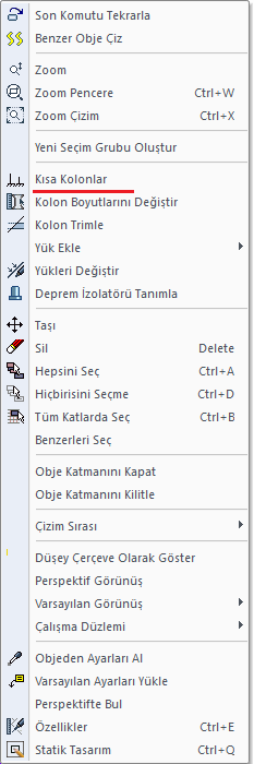Kısa kolonlar komutu ile seçilen kolona TBDY 2018 Madde 7.3.8'de belirtilen kriterler uygulanır.