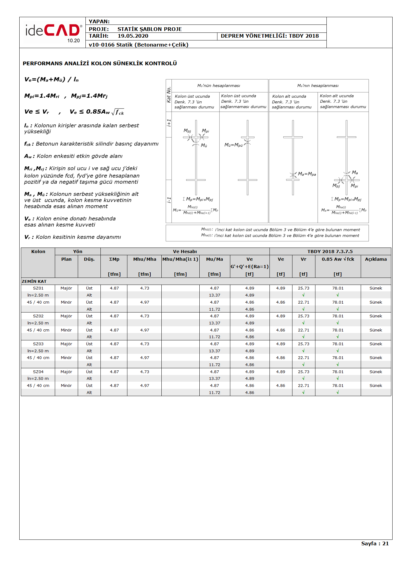TBDY 7.3.8 'e göre kısa kolon olarak tanımlanan elemanlar taşıyıcı sisteme gerçek serbest boyları ile tanımlanmaktadır. Kısa kolon elemanları kesme kuvveti etkisiyle gevrek davranış gösteren elemanlardır. Bu sebeple mevcut yapılarda deprem performansı hesabında kolonlar için TBDY 7.3.7 'ye göre kolon süneklik kontrolü, kirişler için TBDY 7.4.5 'e göre kiriş süneklik kontrolü yapılmaktadır.