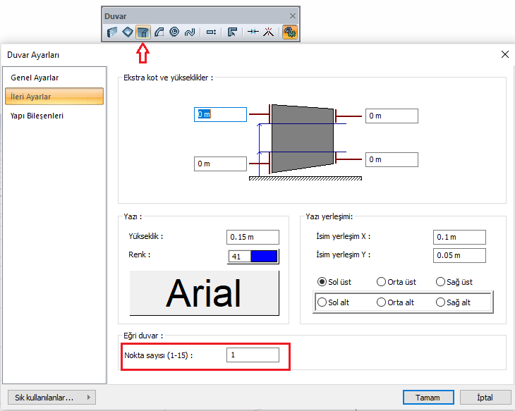 "Köşe pencere" çizmek için; duvarlar "Eğrisel duvar" komutuyla çizilip, duvar ileri ayarlarında eğri duvar nokta sayısı "1" verilir.