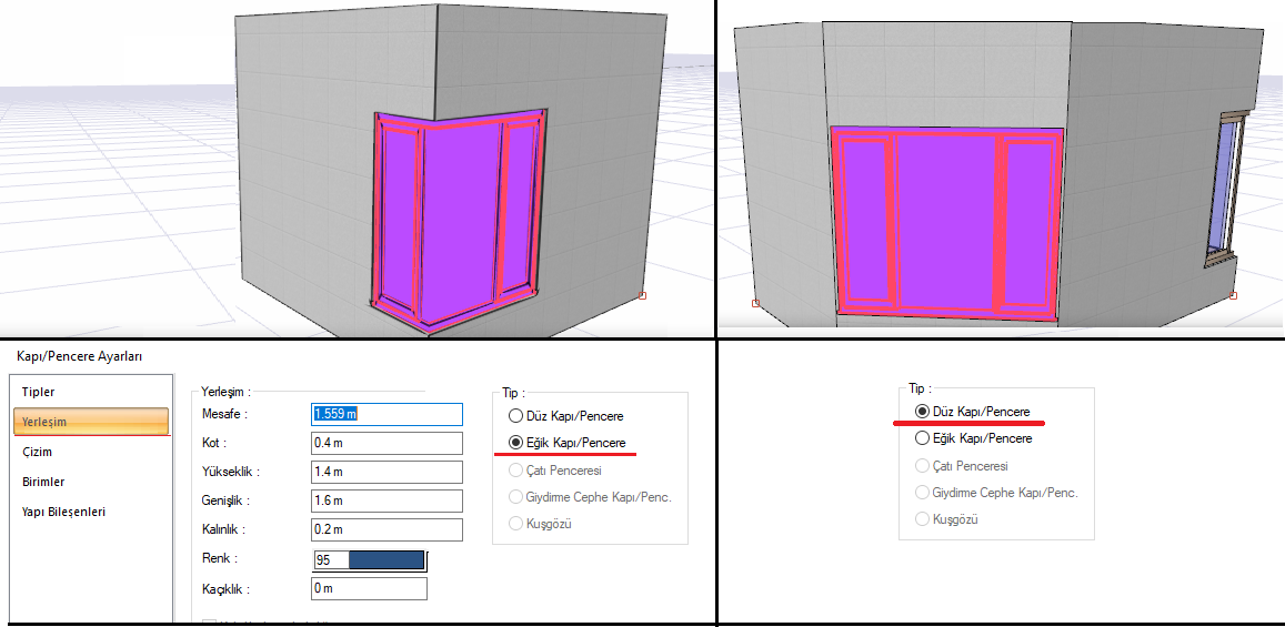 Kapı/pencere ayarlarında eğik kapı/pencere opsiyonu işaretlenirse; pencereler duvarın şeklini alıp yerleşir, düz kapı/pencere opsiyonu işaretliyse köşe duvarı pahlanarak yerleşir.