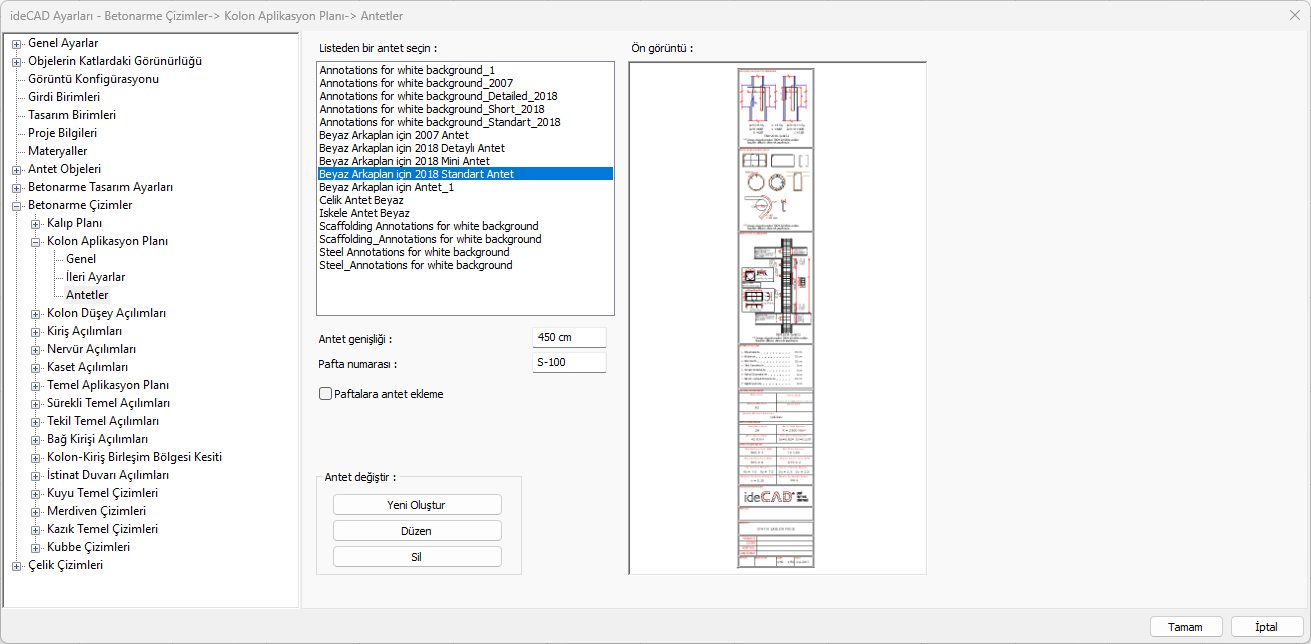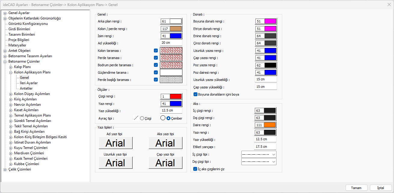 Kolon aplikasyon planı çizimine ait yazıların ölçü ve büyüklükleri, tarama ayarları, pafta ayarları, antet ayarları, tablo ayarları düzenlenir.