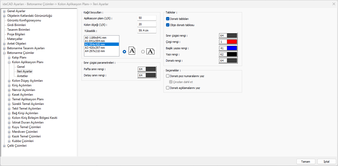 Donatı tabloları ![]() İşaretlenirse, çizime donatı tabloları eklenir. |