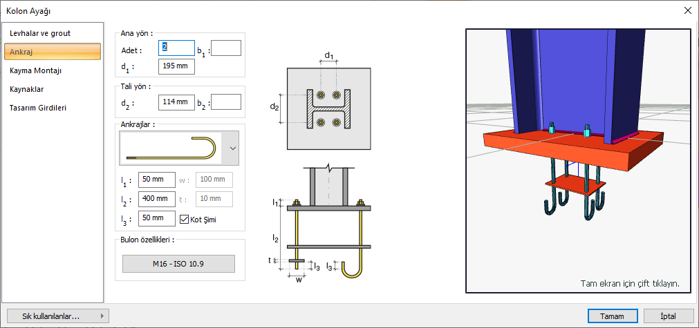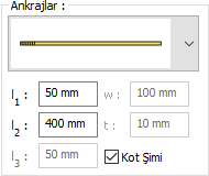 Ankrajlar ![]() ![]() Listeden ankraj tipi seçilir. Ankraj boyutları değerler girilerek belirlenir. Girilecek değerler şematik çizimde gösterilmektedir. |