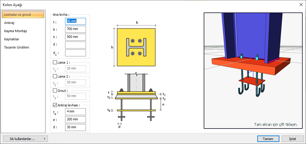 Ankraj levhası ![]() Ankraj levhası değer girilerek belirlenir. Girilecek değerler şematik çizimde gösterilmektedir. |