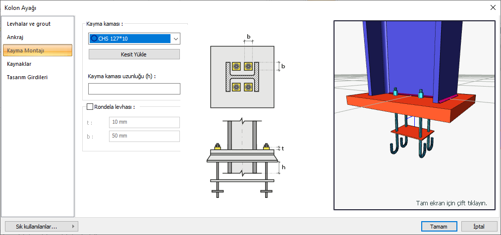 Kolon Ayağı komutu ile çelik kolon-temel birleşimi tanımlanır.