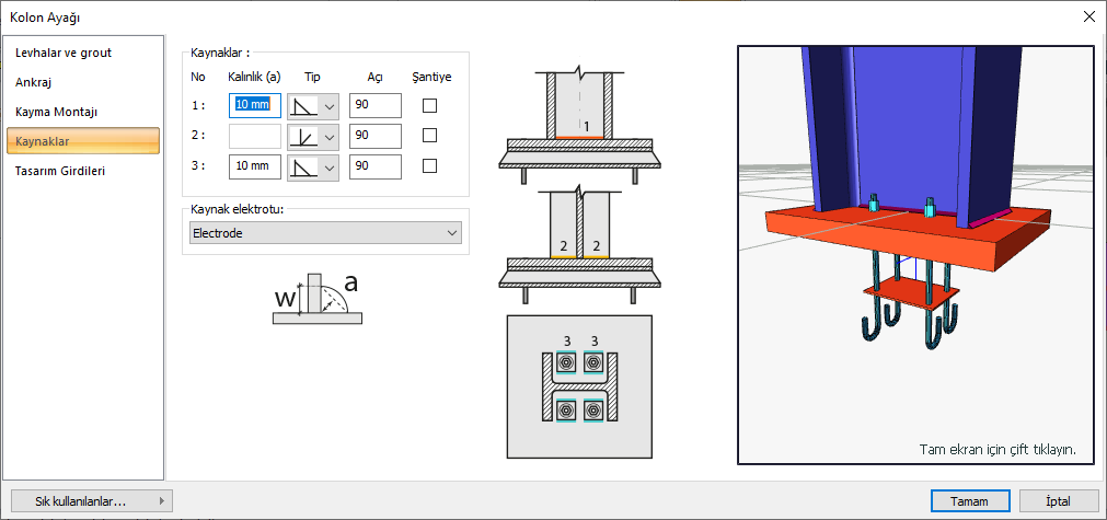 Kaynaklar ![]() Birleşim yerlerine yapılacak kaynakların kalınlık, tip ve açı değerleri verilir. Şantiyede yapılıp yapılmayacağı bilgisi girilir. |
