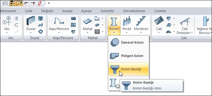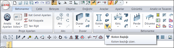 Kolon başlığı komutuyla betonarme kolon başlıkları çizilir. Kolon başlığı çizebilmek için tanımlanmış betonarme kolonlara ihtiyaç vardır. Önce betonarme kolonlar çizilir ve kolon başlıkları üzerine yerleştirilir.