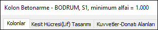 Kolon betonarme tasarım sonuçları ve kolonlara ilişkin yetersizlik durumları Kolon Betonarme diyaloğunda gösterilir. Kolon betonarme diyaloğunda, kolon enine ve boyuna donatıları, analiz sonucunda hesaplanan iç kuvvetler, TBDY 'e ilişkin artırılmış iç kuvvetler, kapasite oranları, kolon-kiriş birleşim bölgesi kesme güvenliği, güçlü kolon kontrolü sonuçları verilir. Kolon donatıları Kolon Betonarme diyaloğunda değiştirilir ve sabitlenir.