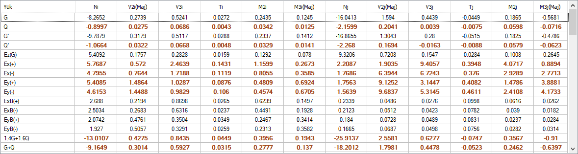 Kuvvetler tablosu ![]() Yük: İlgili yükleme veya yük kombinasyonlarının adıdır. |
