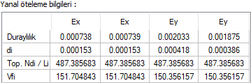 Yanal öteleme bilgileri ![]() Duraylılık: 1.5 di [toplam(Ndi/li)/vfi] <= 0.05 Yukarıdaki koşul sağlanıyorsa, o katta yeterli rijitlik bulunduğu ve yanal ötelenmenin önlenmiş olduğu varsayılır. Aksi durumda yanal ötelenmenin önlenmemiş olduğu varsayılır. |