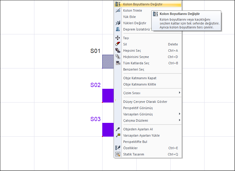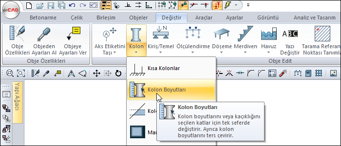 Kolon Boyutlarını Değiştir komutuyla seçilen bir ve birden fazla kolonun boyutları tamamıyla değiştirilir veya belirli değer kadar attırılır ya da azaltılır. Dikdörtgen ve daire kolonlar için geçerlidir.