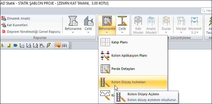 Kolon Düşey Açılımları komutu ile projenin kolon düşey açılımları oluşturulur.