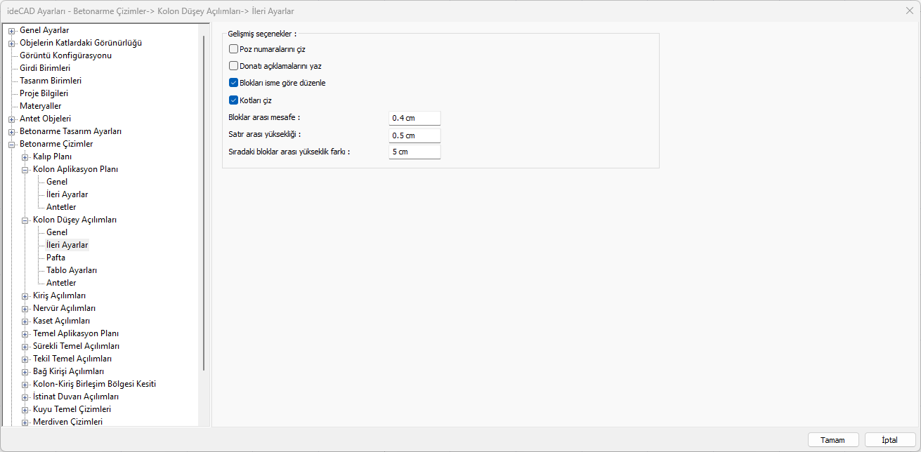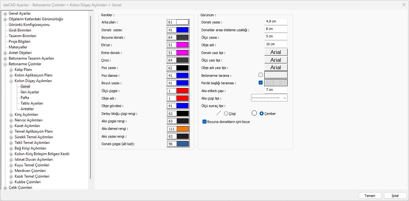 Donatı açıklamalarını yaz ![]() İşaretlenirse, çizimlerde donatı açıklamaları gösterilir. İşaretlenmezse gösterilmez. |