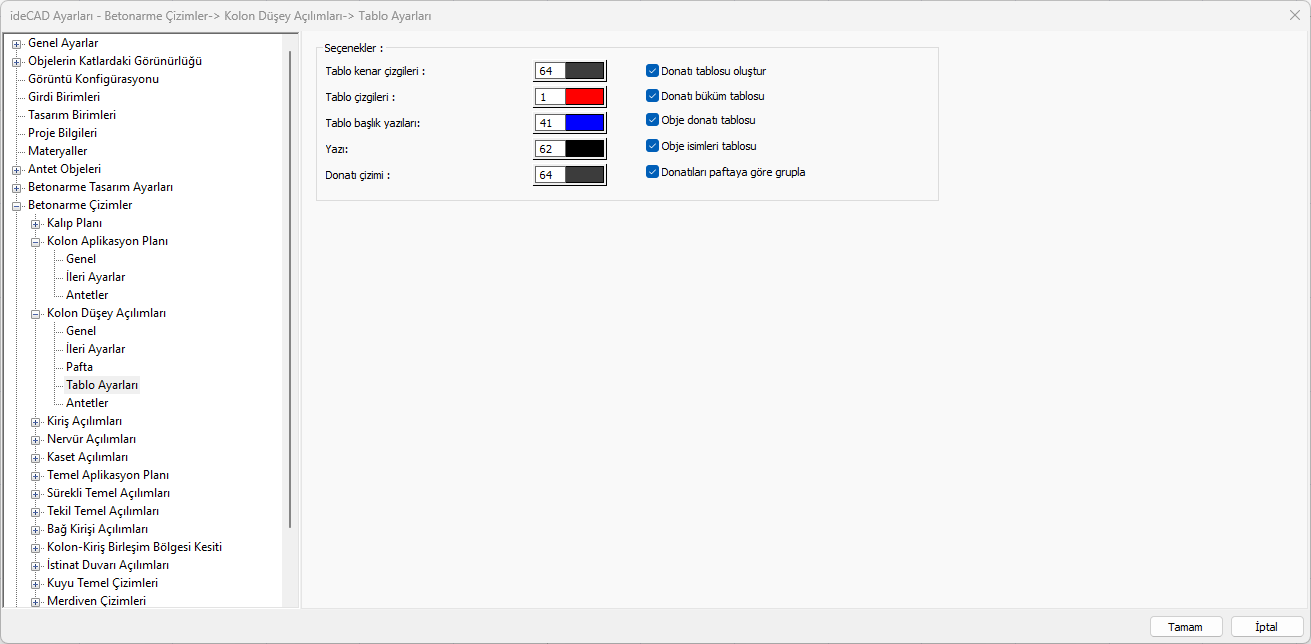 Obje donatı tablosu ![]() İşaretlenirse, obje donatı tablosu oluşturularak çizimde gösterilir. |