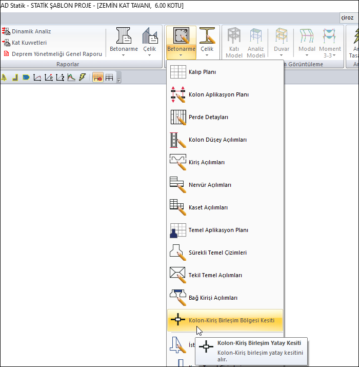 Çizim/Kolon-Kiriş Birleşim Yatay kesit satırını tıklayın.