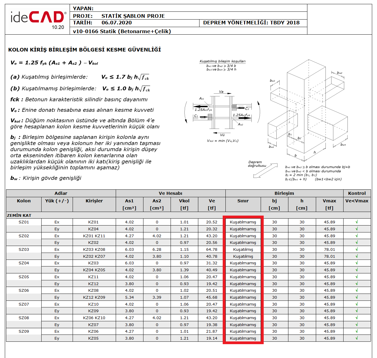 Kolon Kiriş Birleşim Bölgesi Kesme Güvenliği raporunda bu sınıflandırma gösterilmiştir. Aşağıdaki resimde bir rapor örneği ve 7.5.1 'e göre yapılan sınıflandırma durumu gösterilmiştir.