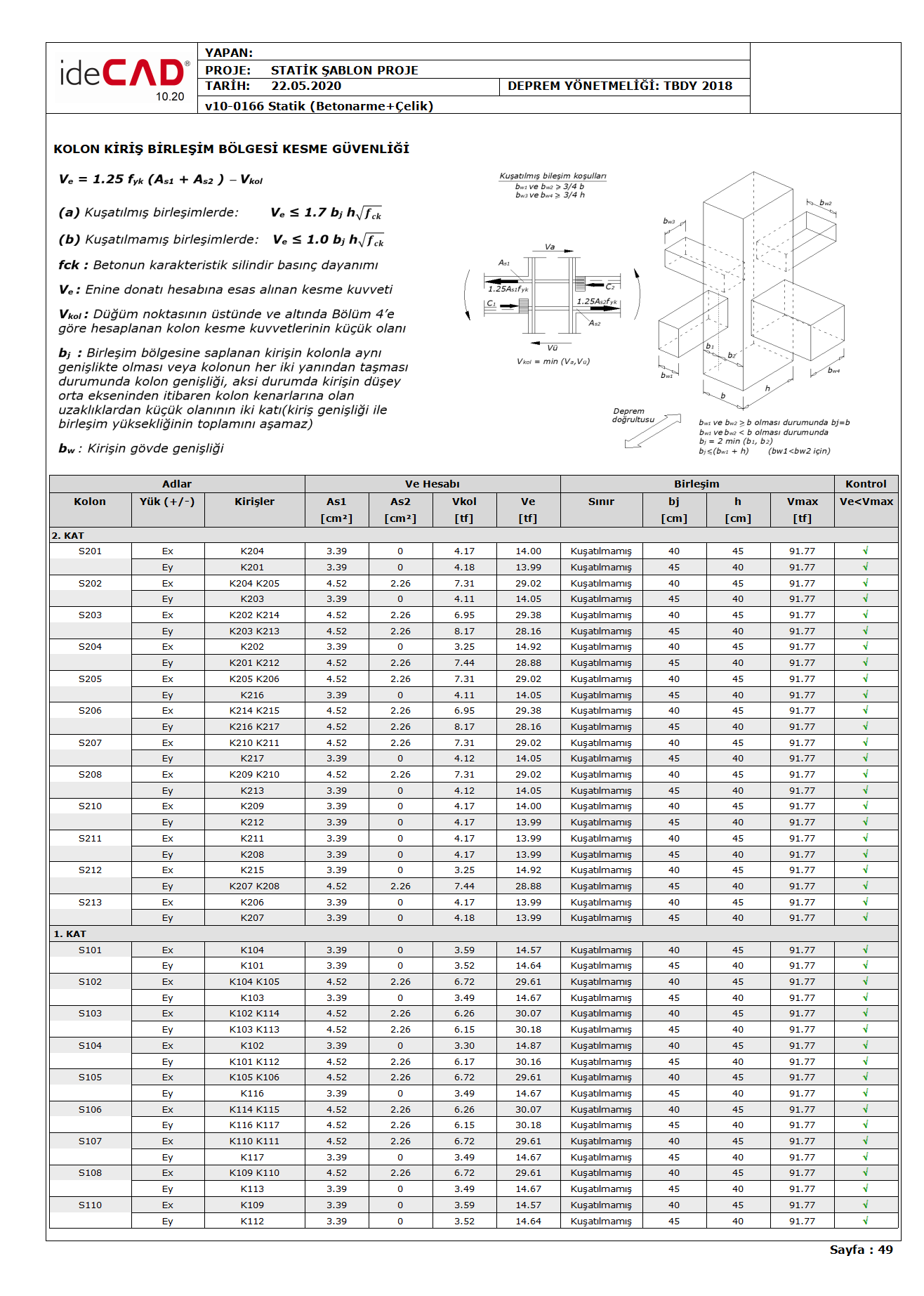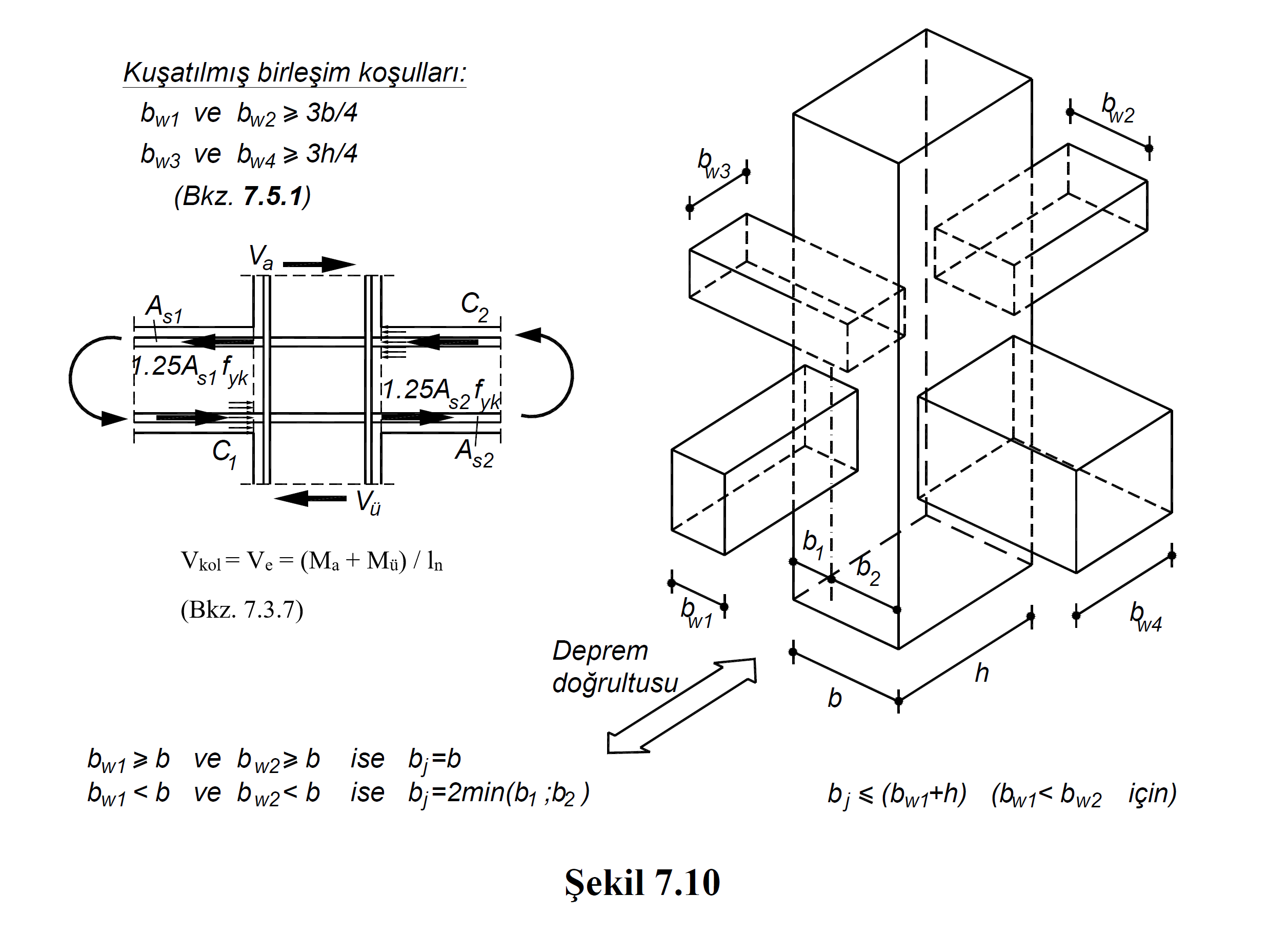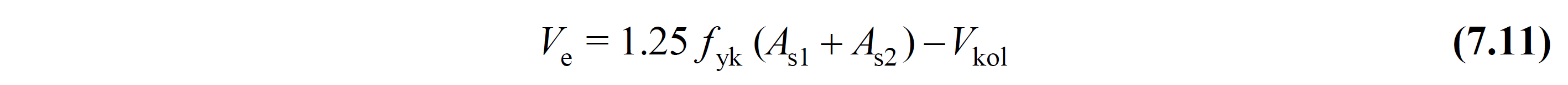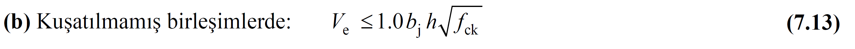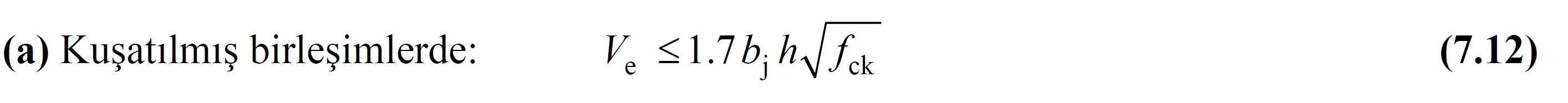Kolon-kiriş birleşim kesme güvenliği hesabına esas Denk.(7.11) 'den hesaplanan Ve değeri, TBDY 7.5.2.2 'de verilen Denk.(7.12) ve Denk.(7.13) 'de verilen kesme dayanımlarını aşmamalıdır.