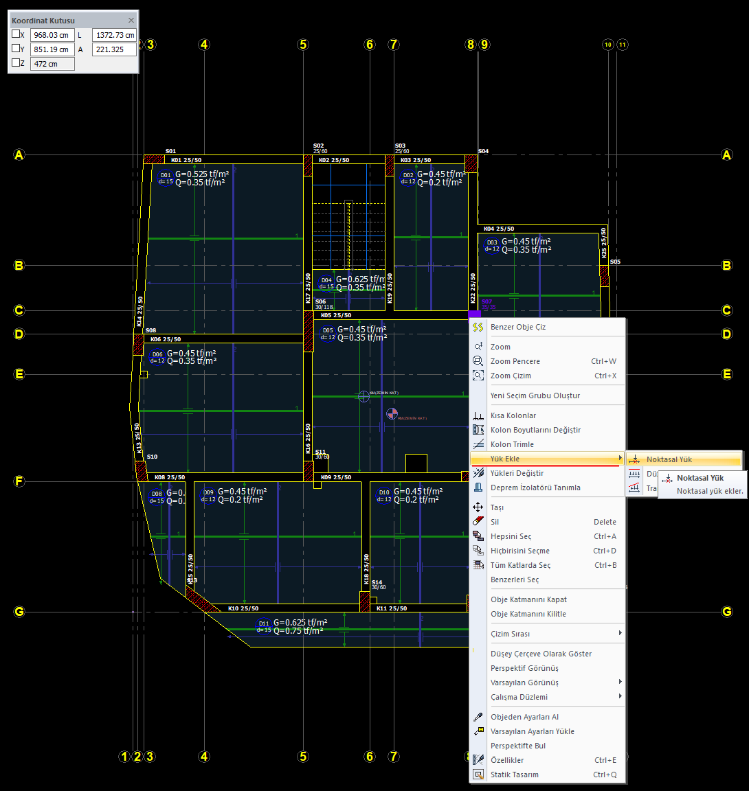 Kolon, kiriş ve perdelere kullanıcı tanımlı yük eklemek için, obje seçilip farenin sağ tuşuyla açılan menüden “Yük Ekle" komutu kullanılır. Elemanlara noktasal yük, düzgün yayılı yük ve trapez yük eklenir.