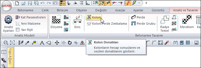 Analiz ve tasarım sekmesi betonarme tasarım başlığında yer alan kolon komutunu tıklayın.