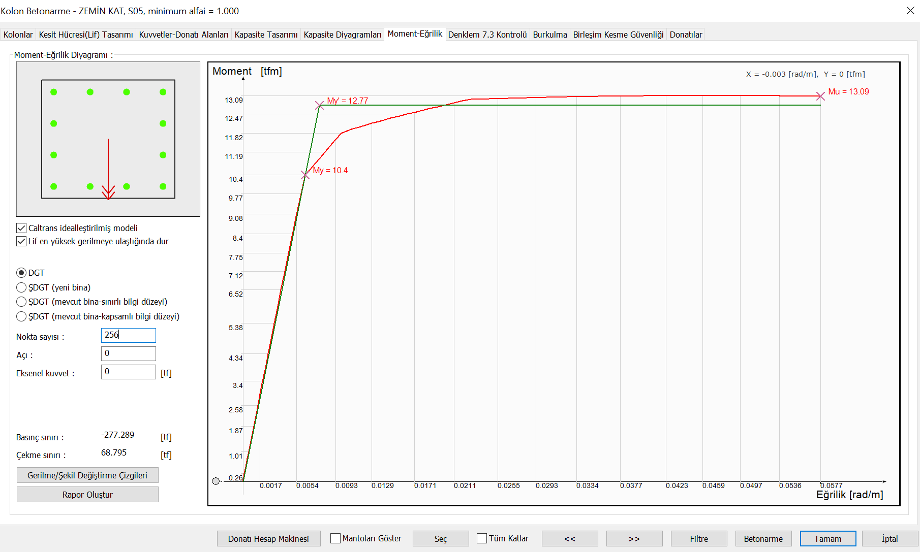 Kolon moment-eğrilik raporu ekrana gelecektir.