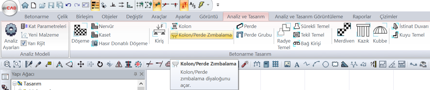 Analizden sonra, ribbon menü Analiz ve Tasarım sekmesi Betonarme Tasarım başlığı altından Kolon/Perde Zımbalama komutuna tıklayarak ulaşabilirsiniz.