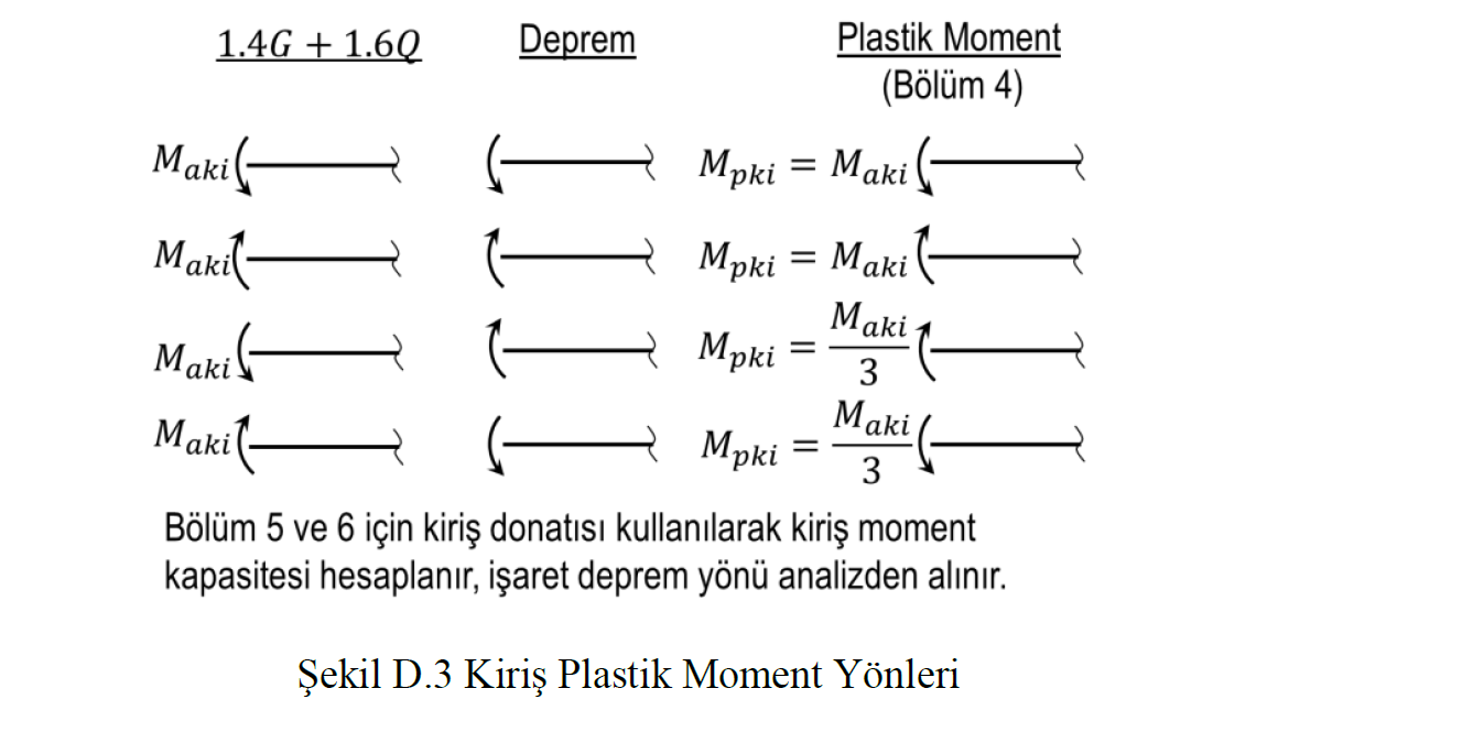 b. Kiriş plastik mafsal oluşumu: Kiriş plastik moment kapasitesi, düşey yükler (1.4G+1.6Q) ile deprem etkilerinin (±E) kiriş ucunda oluşturduğu momentlerin yönleri dikkate alınarak Şekil D.3 ’te gösterildiği durumlara göre hesaplanacaktır. Kirişlerin plastik mafsallaşması ile kolona aktarılan momentler (Mpk22 ,Mpk33) Şekil D.1’de gösterildiği gibi belirlenecektir. Hesaplanan kiriş moment kapasitesi toplamı, birleşim bölgesine bağlanan kolonların sadece deprem etkileri altında (±E) hesaplanan momentleri oranında dağıtılacaktır. Kolon üst ucu için bu hesap Denklem D.2 ile verilmiştir.