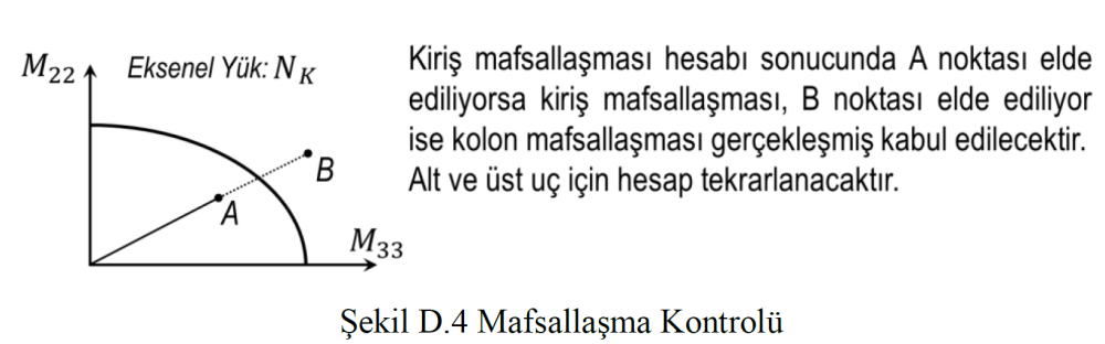 c. Kolon ucu için hesaplanan M22k ,M33k değerlerinin M22 - M33 etkileşim diyagramı içinde kalması durumunda Kiriş Mafsallaşması (KiM), dışında kalması durumunda ise Kolon Mafsallaşması (KoM) olduğu varsayılacaktır (Şekil D.4). KiM durumu için kolon uç momentleri M22k ,M33k, KoM durumu için ise M22p,M33p alınacaktır. Alt ve üst uçta belirlenen KiM veya KoM durumuna göre seçilen üst ve alt uç kritik uç momentler sırasıyla M22krüst,M33krüst ve M22kralt,M33kralt alınacaktır.