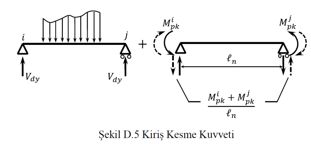 D.3 Kirişler için Ve / Vr değeri sadece Bölüm 6 kapsamında incelenecek yapılar için hesaplanacaktır. Kirişler için tek yönlü eğilme dikkate alınacak (Şekil D.5) ve Ve değeri depremin her iki yönden etkimesi durumları için ayrı ayrı ve elverişsiz sonuç verecek şekilde Denklem D.7 ile hesaplanacaktır.