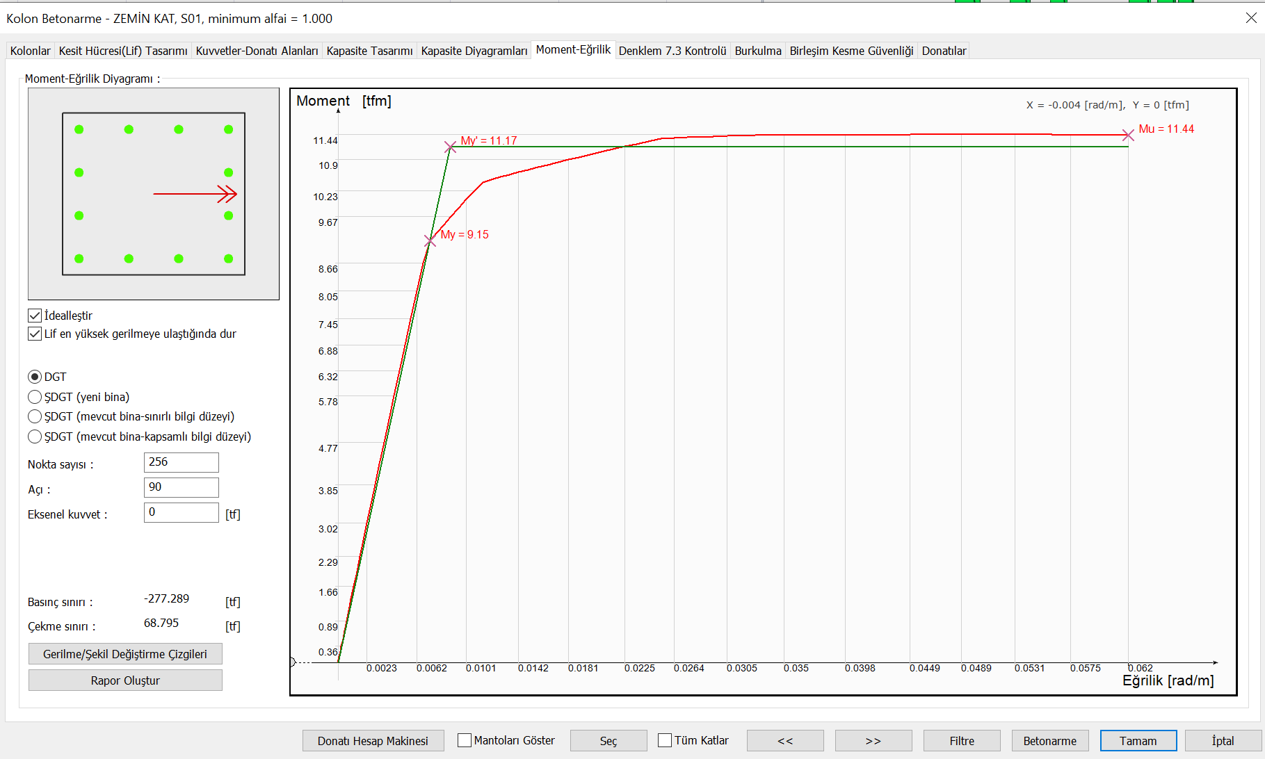 “Kolon Betonarme” penceresinin “Kapasite Tasarımı” sekmesinde, yukarıda anlatılan prensipler kullanılarak her bir yükleme kombinasyonunda kapasite oranları hesaplanmaktadır.