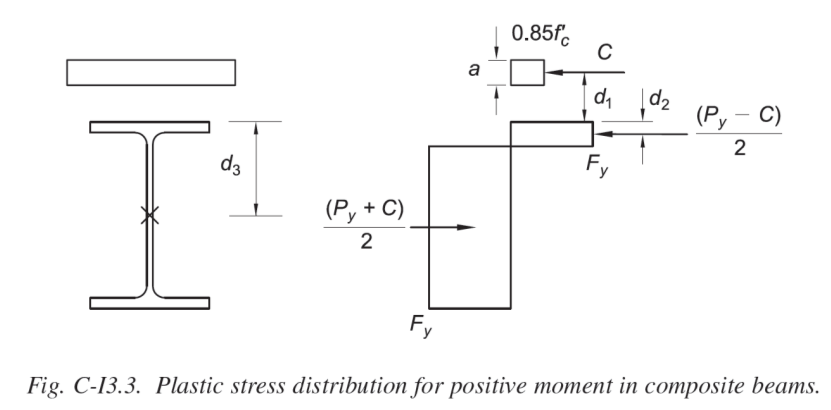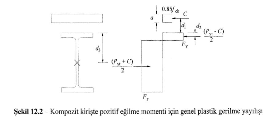 Karakteristik eğilme momenti dayanımı, Mn , TÇY bölüm 12.4.2.1 ve AICS 360-16 I3.2a ‘ya göre kompozit kesitte plastik gerilme dağılımı yöntemi ile belirleniyor.