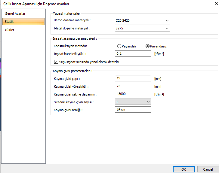 ideCAD Statik ile kompozit döşeme tanımlanırken,