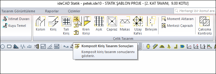 Analiz yapıldıktan sonra, ribbon menü Analiz ve Tasarım sekmesi Çelik Tasarım başlığı altından Kompozit Kiriş Tasarım Sonuçları komutuna tıklayarak ulaşabilirsiniz.