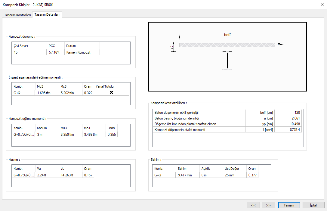 Kompozit kiriş tasarım sonuçları ve Kompozit kirişlere ilişkin yetersizlik durumları Kompozit Kirişler diyaloğunda gösterilir. Tali çelik kirişlerin üzerine kompozit döşeme tanımı yapıldığında bu elemanlar için kompozit kiriş tasarımı yapılır. Kompozit Kirişler diyaloğunda kompozit çelik kiriş özellikleri (beton etkin genişlii, kompozit kesit tarafsız eksen, kompozit atalet momenti), inşaat aşaması eğilme momenti kontrolü, kompozit eğilme kontrolü, kesme kontrolü ve sehim kontrolü verilir.