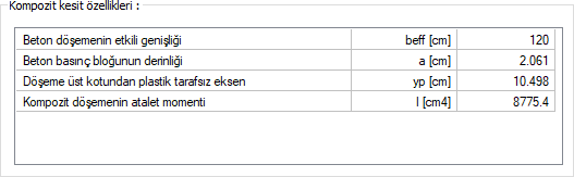 Kompozit kesit özellikleri ![]() Beton döşemenin etkili genişliği: ÇYTHYEDY BÖLÜM 21.4.1.1’de verilen tanıma uygun olarak hesaplanan ve kompozit kiriş tasarımında kullanılan parametredir. |