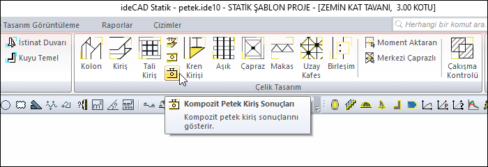 Analiz yapıldıktan sonra, ribbon menü Analiz ve Tasarım sekmesi Çelik Tasarım başlığıaltından Kompozit Petek Kiriş Sonuçları komutuna tıklayarak ulaşabilirsiniz.