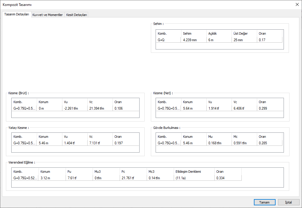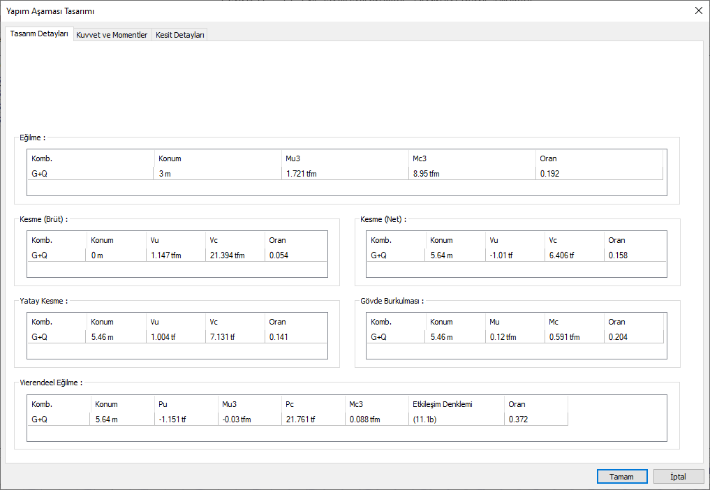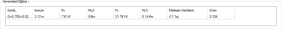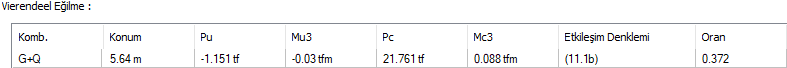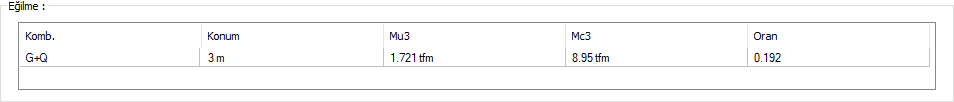 Komb.: En elverişsiz kesit kuvvetlerini oluşturan kombinasyondur. Konum: Tasarımda dikkate alınan kesit kuvvetlerinin kiriş üzerindeki konumudur. Mu3: Elemana 3 yönünde etkiyen moment değeridir. Mc3: Elemanın 3 yönündeki moment kapasitesidir. Oran: Moment-kapasite oranıdır.