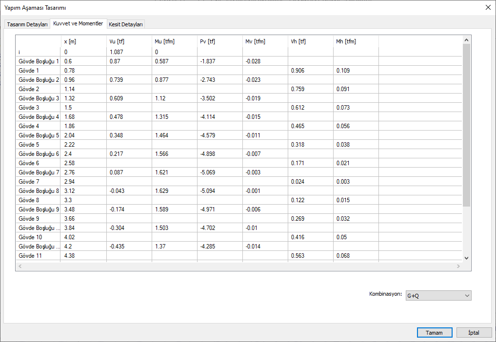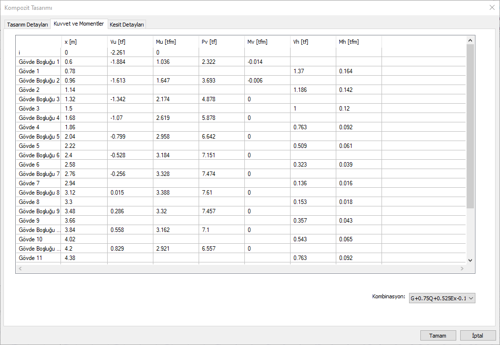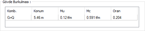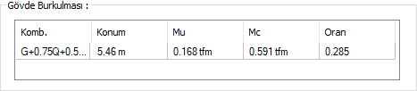 Komb.: En elverişsiz kesit kuvvetlerini oluşturan kombinasyondur. Konum: Tasarımda dikkate alınan kesit kuvvetlerinin kiriş üzerindeki konumudur. Mu: Elemana etkiyen moment değeridir. Mc: Elemanın moment kapasitesidir. Oran: Elemana etkiyen momentin kapasiteye oranıdır.