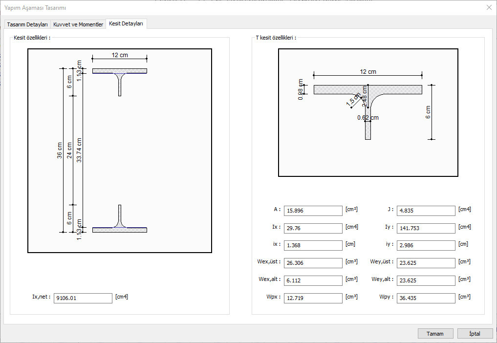 A: Kesit alanını gösterir. J: Polar Atalet momentini gösterir. Ix: x yönündeki atalet momentini gösterir. Iy: y yönündeki atalet momentini gösterir. ix: x yönündeki atalet yarıçapını gösterir. iy: y yönündeki atalet yarıçapını gösterir. Wex,üst: üst başlık bölgesinde, x yönündeki elastik mukavemet momentini gösterir. Wey,üst: üst başlık bölgesinde, y yönündeki elastik mukavemet momentini gösterir. Wex:alt: alt başlık bölgesinde, x yönündeki elastik mukavemet momentini gösterir. Wey,alt: alt başlık bölgesinde, y yönündeki elastik mukavemet momentini gösterir. Wpx: x yönündeki plastik mukavemet momentini gösterir. Wpy: y yönündeki plastik mukavemet momentini gösterir.