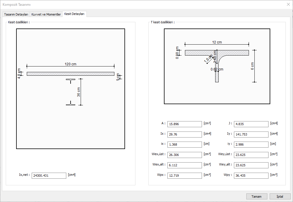 Kompozit petek kiriş tasarım sonuçları ve kompozit petek kirişlere ilişkin yetersizlik durumları Kompozit Petek Kirişleri diyaloğunda gösterilir. Tali kirişlerin enkesitleri petek kiriş olarak seçilir ve bu tali kirişlerin üzerine kompozit döşeme tanımı yapılır ise kompozit petek kiriş tasarımı kullanılır. Kompozit Petek Kirişleri diyaloğunda brüt ve net alanda kesme, gövde burkulması, vierendeel kontrolleri ile birlikte iç kuvvet sonuçları ve net atalet momenti hesabı da verilir.