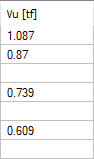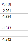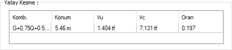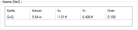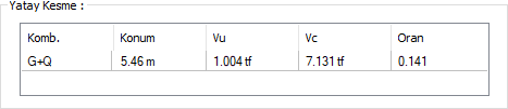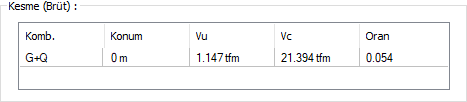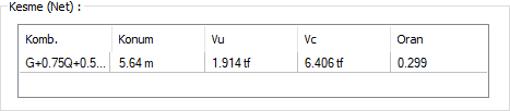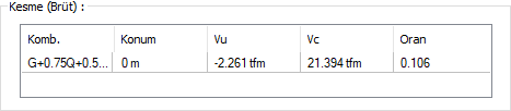 Komb.: En elverişsiz kesit kuvvetlerini oluşturan kombinasyondur. Konum: Tasarımda dikkate alınan kesit kuvvetlerinin kiriş üzerindeki konumudur. Vu: Elemana etkiyen kesme kuvvetidir. Vc: Elemana ait kesme kuvveti kapasitesidir. Oran: Elemana ait kesme kuvvetinin kapasiteye oranıdır.