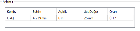 Komb.: En elverişsiz kesit kuvvetlerini oluşturan kombinasyondur. Sehim: Petek kirişte oluşan sehimdir. Açıklık: Petek kirişin boyudur. Üst değer: Kirişin yönetmeliğe göre sehim üst değeridir. Oran: Kirişin yaptığı sehimin sınır değere oranıdır.