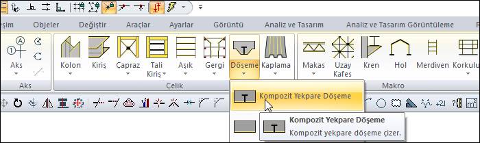 Kompozit Yekpare Döşeme komutuyla kompozit yekpare döşeme oluşturulur. Kompozit yekpare döşemeler, çelik kirişler arasına ve tali kirişlerin üzerine çizilen yük aktaran elemanlardır.