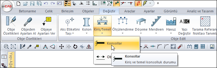 Konsol durumunda olan kirişlerin ve temel kirişlerin konsol tasarımı, analiz sonucunda otomatik olarak tespit edilir. Konsollar komutuyla kiriş ve temel kirişlerin konsol durumu değiştirilir.